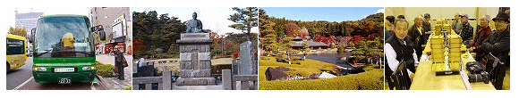 昨日までの暖かさとは打って変わり急に冷え込んだ中、高速道路の外気温は4℃を表示しましたが、バスの中はぽかぽかでまもなく幹事さんから飲み物やお菓子が配られたりして、なごやかな雰囲気の車内も一段と賑やかになってきました。バスは東北自動車道を順調に走り、あっという間に白河インターを下り、南湖公園にある翆楽苑に着きました。