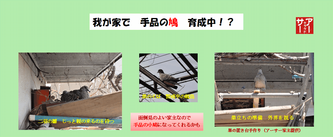 いよいよ巣立ちです 場所、手作りの巣置き台設置、カラスの立ち入り禁止等、私は面倒見の良い家主なので、小