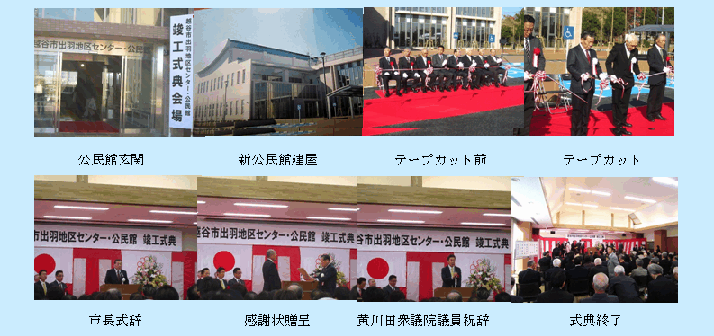 平成25年11月24日(日)午前10時より新しい越谷市出羽地区センター・公民館の竣工式記念式典が公民館正面駐車場で行われました。私も出羽公民館運営協力委員会の一員として参列しました。