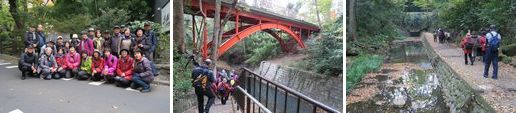 越谷・新越谷の各駅で24名の参加者は半蔵門線長津田行きに乗車。途中二子玉川で東急大井町線に乗り換え、等々力駅で下車、徒歩5分で等々力渓谷入口に着き、参加者全員の写真撮影を済ませ、階段を降りると