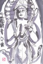 そろそろ休憩 上里IC 8時。ここらより山の姿が見え始めてきた。車窓からは妙義山の山並み、小諸を過ぎ、高速道路の終着地 東湯の丸IC 9時過ぎごろに下り、一般道を東御市(とうみし)の町並みを通り、地蔵峠に向かう。山林の中を進むこと45分。5月初めの頃の緑が幾重にも重なり、そのなかに山藤のむらさき色、山吹の黄色そして山肌を縫うように落ちる清流。快適な車窓だ。また、左右の山道には2,3百メートル置きに石仏の勢至観音、十一面観音、三面観音等など、まるで旅の無事を祈っているようだ。