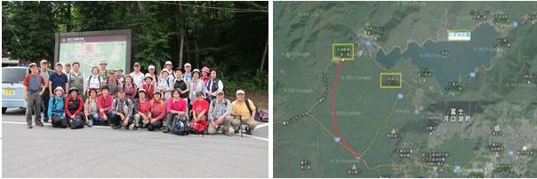 全員の記念写真を撮り、いよいよ「青木ヶ原の樹海」に入る。赤い線で示した「青木ヶ原樹海の遊歩道(2600m)」を歩いた。