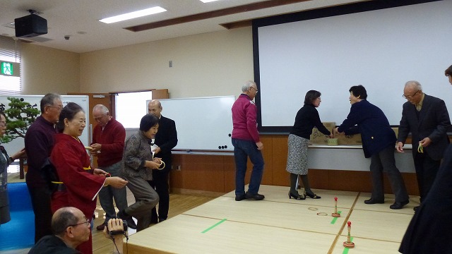岩崎さん・水野さんによる[楽しい輪投げゲーム]では、すぐ近くの的に2回投げるのですが、なかなか難しいものです。
